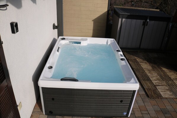 Genießen Sie Ihren privaten Balkon und die offene Terrasse. Ein privater Outdoor-Whirlpool auf der Terrasse steht vom 1. Mai bis 15. Oktober zur Verfügung. Das großzügige Gelände bietet zusätzlichen Platz im Freien, während Ihr eigener Terrassengrill zu gemütlichen Grillabenden einlädt. Ein besonderes Highlight ist die private Fasssauna auf der Terrasse.
