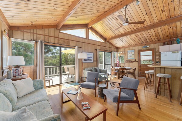 Inside, you'll find an open living area complete with ample seating; making it the ideal place to hang with family and friends. When it's time to prepare meals, the kitchen has everything you need and more for the chef in your family including a gas range stove and plenty of counter space. With breakfast bar seating for 5 and dining room seating for 6, the whole crew can enjoy meals together. Plus, you can dine outside on the sundeck and enjoy those breezy OBX evenings! The living area also features access to the screened porch where you'll find a porch swing and additional seating. Each bedroom provides you the perfect space to relax and unwind after a fun day on the OBX! Additional amenities at Bayberry Cottage include beach toys, bikes, and more. With so many great amenities and a great location, now is the time to book your stay at Bayberry Cottage!
