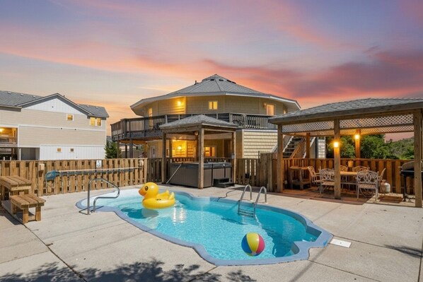 Dieses Cottage bietet für jeden etwas. Ein glitzernder Pool (mit freiem Pool Wärme im Frühjahr und Herbst), ein Whirlpool, der das ganze Jahr geöffnet ist und viel Decking in der Nähe des Pools. Es gibt zwei Pavillons auf dem Grundstück. Einer beherbergt den Whirlpool, so dass er regen oder scheinen kann und der andere befindet sich im Poolbereich für zusätzlichen Schatten (und einen Snack zu genießen)! Es gibt Unmengen an Decks und Sonnendecks, um alles zu genießen, was die Outer Banks bieten. Der Poolbereich ist eingezäunt und somit sehr privat. Das Roundabout Resort verfügt über zwei voll ausgestattete Küchen mit 2 Herden / Öfen, 2 Mikrowellen, einer Keurig-Kaffeemaschine und einer Standard-Kaffeemaschine und ist perfekt für einen Zweifamilienurlaub geeignet!