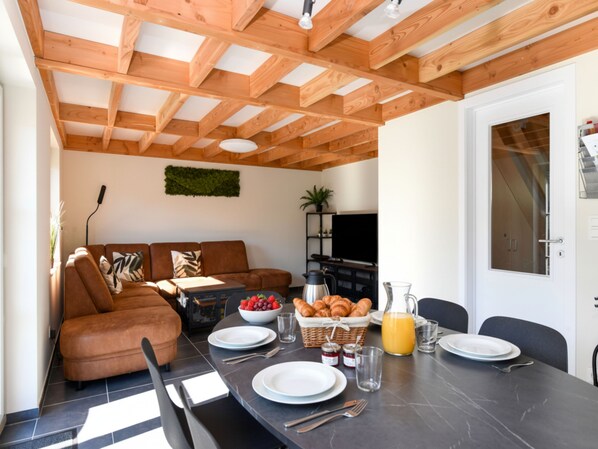 Parterre: offene Küche mit Kochplatte, Wasserkocher, Kaffeemaschine(Filter, senseo pads), Backofen, Mikrowelle, Geschirrspüler, Kühlschrank(+ Gefrierfach) , Wohn/Esszimmer mit TV(Flatscreen, digital, smart TV), Esstisch, Sitzecke , Schlafzimmer mit Doppelbett(Doppelbettdecke, 180 x 200 cm) , Badezimmer mit Dusche(ebenerdige Dusche), Waschbecken, Föhn , Toilette mit Toilette , Abstellraum mit 1x Hochstuhl