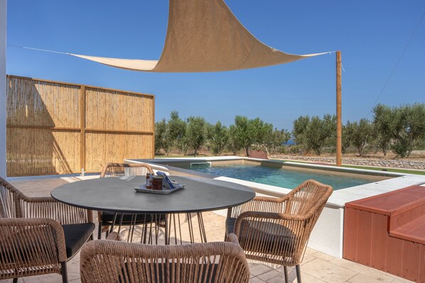 Elaionas Luxury Apartments auf Kos liegen in den Hügeln inmitten eines Olivenhains und bieten Ihnen Ruhe und Entspannung. Genießen Sie Ihren privaten Hydropool mit Düsen (3 m breit, 4 m lang, 1,5 m tief). Pool-Bademäntel und Handtücher werden bereitgestellt. Die gepflegten Gärten bieten Ausblicke auf Felder, Olivenbäume und schöne Sonnenuntergänge.