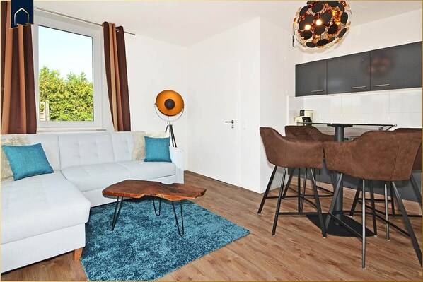 Willkommen an der Ostsee – Erholung pur in Top-Lage Diese charmante Ferienwohnung auf Usedom bietet mit 53 m² alles, was es für einen entspannten Urlaub braucht – ob zu zweit, mit Freunden oder als kleine Familie. In ruhiger Lage, nur 350 Meter vom feinsandigen Strand entfernt, erwartet Sie ein modernes Urlaubsdomizil mit komfortabler Ausstattung. Der großzügige Wohnbereich mit gemütlicher Sofaecke, TV und Essplatz lädt zum Entspannen ein. Die offene Küche ist voll ausgestattet – inklusive Backofen, Geschirrspüler, Espressomaschine und mehr – ideal für Selbstversorger. Für erholsamen Schlaf sorgt ein separates Schlafzimmer mit bequemen Betten. Insgesamt finden bis zu 4 Personen Platz. Das moderne Badezimmer verfügt über eine Dusche und warmes Wasser – ideal für die Erfrischung nach dem Strand.