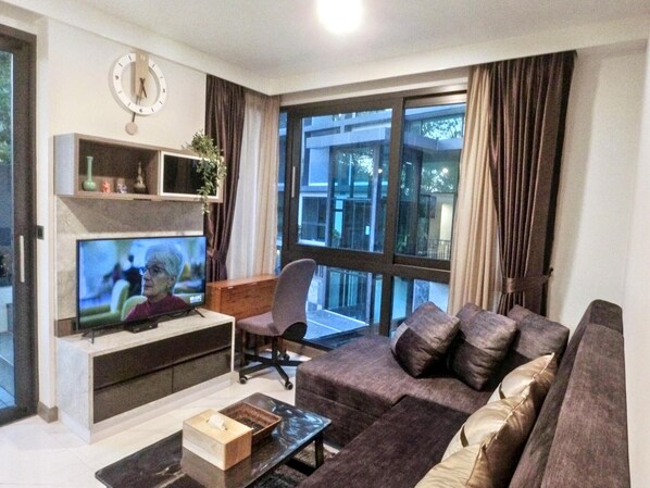 2. Diese 1-Zimmer-Wohnung hat eine Gesamtfläche von 42 m² und ist mit allen Annehmlichkeiten/Geräten für Ihren Aufenthalt gut ausgestattet. Sie verfügt über eine voll ausgestattete Küche (Mikrowelle, Kühlschrank, Elektroherd, Geschirrspülbecken, Toaster, Reiskocher, Wasserkocher, Teller, Löffel, Messer, Weinöffner, Topf, Bratpfanne und andere Dinge), damit Sie sich leichte Mahlzeiten zubereiten können (kochen Sie bitte keine schweren Mahlzeiten, da der Rauchalarm losgeht). Espressomaschine mit Kaffeepulver, damit Sie den ganzen Tag Kaffee genießen können (kostenlos in der Kaffeeecke an der Rezeption erhältlich). Wir bieten auch einen Hybrid-Esstisch mit Öko-Stühlen für Ihre stundenlange Online-Arbeit mit Glasfaser-LAN-Kabel, damit Sie Tag und Nacht über ein sehr starkes Internet arbeiten können.
