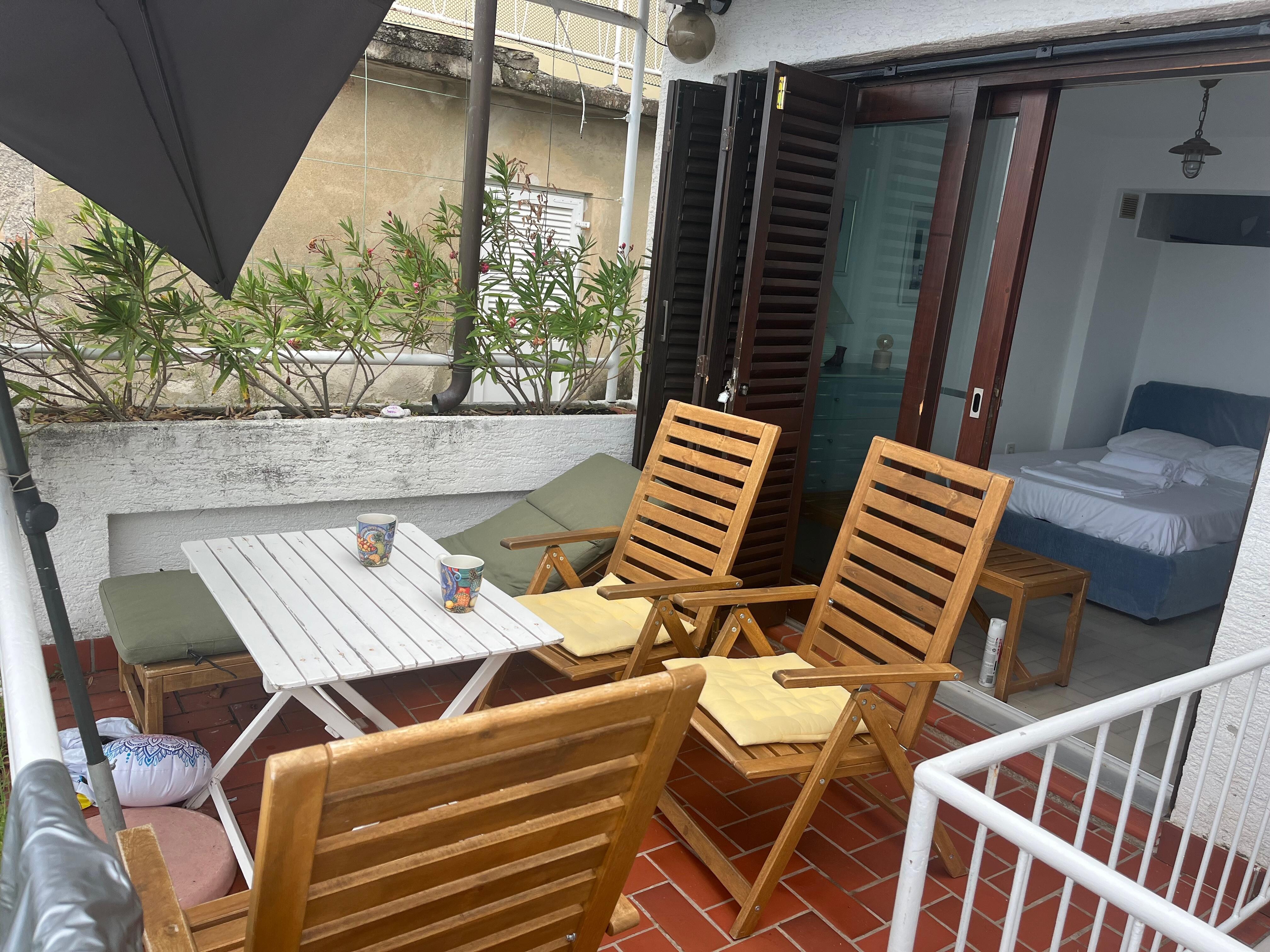 Der Balkon ist ein entspannender und stilvoller Wohnbereich, der mit Sonnenliegen, einem Sonnenschirm und einem weiteren Esstisch ausgestattet ist, wo die Gäste ihre Mahlzeiten im Freien genießen können.