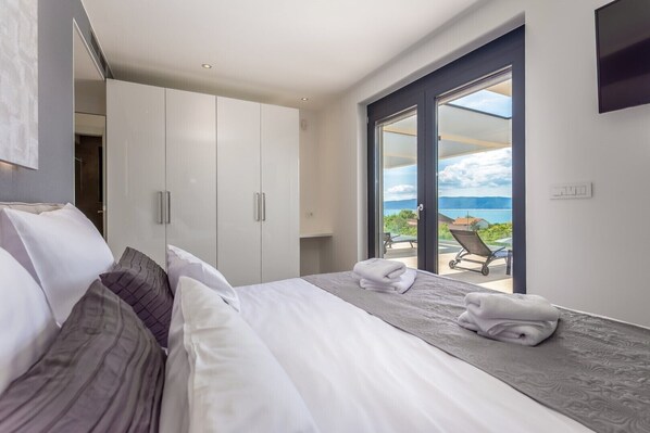 Die moderne und harmonisch eingerichtete Villa Quadra bietet auf 200 m2 Platz für 10 Personen in 5 modernen Schlafzimmern mit 4 Bädern. Im Erdgeschoss der Villa befinden sich ein Schlafzimmer und ein Badezimmer. Exklusiv eingerichtete Küchen und Essbereiche sind der perfekte Ort für ein Familienessen, während Sie sich in der schönen Lounge von der Sommerhitze in einer voll klimatisierten Umgebung entspannen können. Es gibt auch eine separate Toilette im Erdgeschoss, einen Abstellraum, eine Waschküche und einen Flur, der zum Obergeschoss führt. Im Obergeschoss finden Sie 3 schöne Schlafzimmer mit jeweils separatem Bad und ein Kinderzimmer mit Etagenbetten.