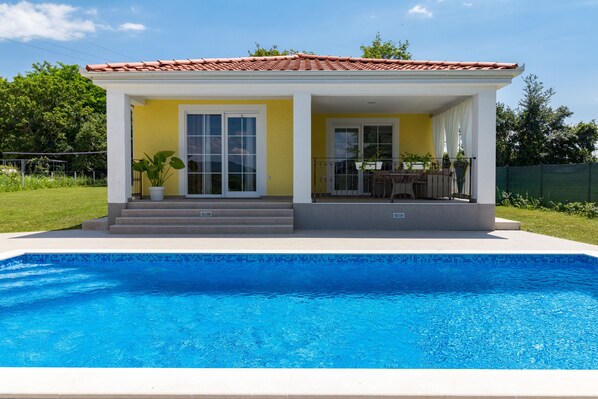 So fühlt es sich an, wenn man an der sonnengelben Villa Mario in Cepic Polje in der Gespannschaft Krsan ankommt. Das kleine Örtchen liegt sehr ruhig nur gut 10 Kilometer von Labin entfernt, nahe der Kvarner Bucht.