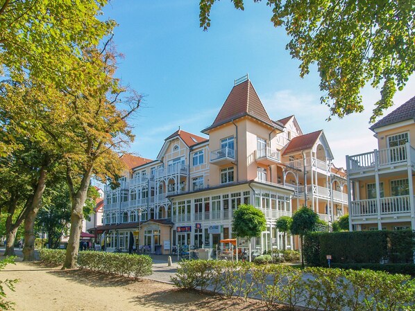 Die Appartementanlage Dünenschloss wurde im Jahr 2005 liebevoll im klassischen Bäderstil mit Türmchen, Giebeln, Erkern und Holzbalkonen neu errichtet. Hier können Sie die Seele baumeln lassen und ein bisschen Wellness genießen. In der Anlage befinden sich eine Bio-Sauna, eine finnische Sauna, Ruhebereich, ein Fitnessraum sowie ein hauseigenes Schwimmbad. Die liebevoll und hell eingerichteten 3-Raum-Ferienwohnungen verfügen über einen Balkon, WLAN und einen Pkw-Stellplatz hinter dem Objekt. Die Wohnungen sind über einen Fahrstuhl erreichbar.