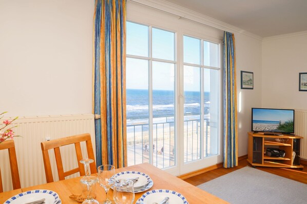 Größe ca. 60 qm - Wohnzimmer mit Schlafcouch, Esstisch, Küchenzeile, Kabel.TV, Radio und französisches Fenster mit freiem Meeresblick - Schlafzimmer mit Doppelbett und Kleiderschrank - Gästezimmer mit Einzelbett mit Ausziehfunktion (90x200) und Anrichte - Küchenzeile mit Mikrowelle, Zweiplattenkochherd, Geschirrspüler, Kühlschrank, Kaffeemaschine, Wasserkocher und Toaster. Flur mit Garderobe und Spiegel. Dusche /WC