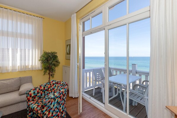 Die 84 m² große 3-Zimmer-Turmwohnung erstreckt sich über drei Etagen und ist für bis zu 4 Personen geeignet. Besonders hervorzuheben ist die direkte Strandlage der Apartmentanlage und der großartige Meerblick aus dem Apartment und von dem nach Norden gelegenen Balkon auf die Ostsee.
