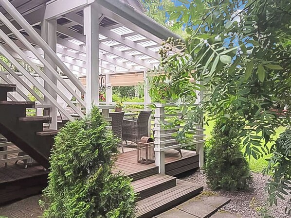 This cabin is set on a spacious, grassy plot that enjoys plenty of sunshine. The cabin's covered terrace allows for outdoor enjoyment even in rainy weather.