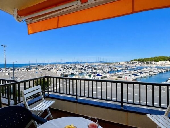 Spüren Sie die Meeresbrise vom Hafenbalkon.: Flucht an die Küste: Apartment mit Terrasse und Panoramablick auf den Hafen.