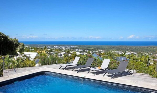 At Villa Jîvana, enjoy a spacious, light-filled living area and an expansive veranda, ideal for unforgettable moments with family or friends overlooking the horizon. The pool, heated during the austral winter, invites you to relax after a day of exploration. To enhance your stay, a barbecue and a foosball table are available for the enjoyment of both young and old.