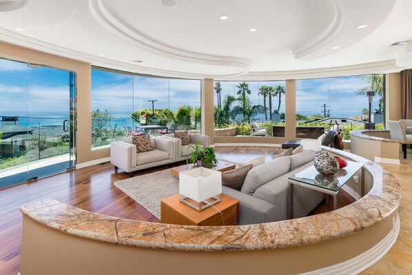 Located in the fabulous Muirlands Point neighborhood of La Jolla, this beautiful contemporary residence was built new in 2006. It has been impeccably maintained as a family vacation home, has breathtaking panoramic ocean views, incredible custom finishes, dramatic curvilinear architecture, exceptional open contemporary floor plan, expansive outdoor spaces and seating with a large hot tub, grill, floor-to-ceiling glass, a large theatre room with rocking/reclining leather chairs, 4 bedrooms/5.5 baths plus private office with desk, printer, large monitor. Additional sleep areas on the 1st floor with pull-out Queen sofas in the TV room and a twin bed in the adjoining room. Photos show the 4th bedroom with a twin bed, however, now there is a Full Bed, CA King in the master, CA King in 2nd, and Queen in 3rd. The master bedroom has a double shower and hot tub. The garage has Tesla charger.