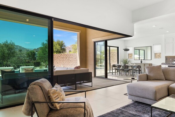 Experience the best of resort-style living while savoring the comforts and seclusion. Experience the ultimate luxury in this stunning, 3,156 sq. ft modern 4 bedroom, 4.5 bath property. Our retreat is embraced by scenic mountains, many nearby golf courses, shopping, dining, and enjoy constant sunshine throughout the year. Here, you can spend relaxing days in the private pool/spa, and attend tennis events and music festivals.