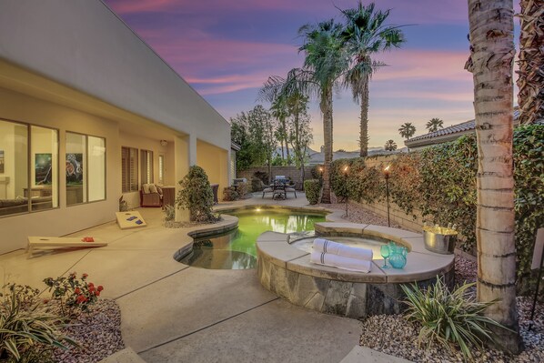 Take in the SoCal sun in the pool and catch some rays on the tanning shelf or one of the four lounge chairs. Grill up some lunch on the barbecue and enjoy a meal al fresco at the dining table with seating for six. Challenge friends and family to the bean bag toss game. After a fun-filled day, take a soak in the spa or relax with some sparkling conversation at the propane fire table with seating for six.