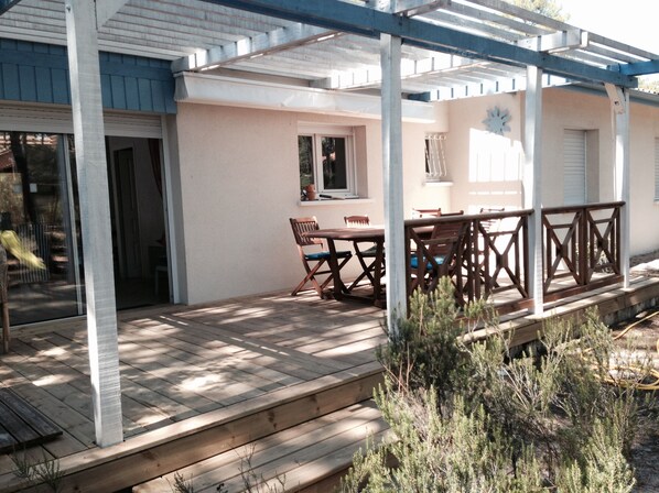 Large, detached, single-storey villa in a peaceful setting under pine trees, enclosed garden.