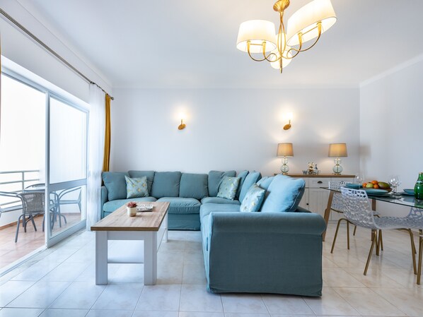 The apartment offers two bedrooms, one bathroom complete with bath and a fully equipped kitchen. You can feel the personal touch of the owners who personally refurbished their second home to this stylish accommodation with modern lounge/dining area with sleeping sofa that has access to a balcony overlooking the neighborhood. Here you can enjoy the afternoon sun. The main bedroom has a double bed and the second bedroom has two single beds. From the kitchen there is access to another small balcony including a BBQ to enjoy the summer nights in the Algarve.