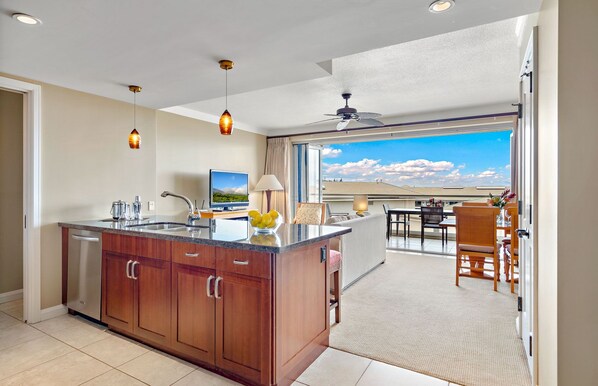 The kitchen is fully appointed with stainless steel Bosch appliances and granite countertops, as well as our commercial grade Vitamix blender for use with smoothies or libations of your choice. One of the hallmarks of this suite is its southern exposure which offers morning sunshine shelter from the northeast trade winds. All of the creature comforts you expect coupled with the experience that Honua Kai offers.