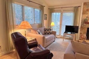 This light, cheery, well-decorated three-level, two bedroom, two bath condo offers views of Young's Mountain with summer peeks and seasonal views of Lake Lure. Steps lead up to a vaulted ceiling great room with sofa, love seat and leather recliner.  A glass top table seats 6 with 2 chairs along a breakfast counter. Majestic stone gas fireplace highlights this room with a flat screen HD TV/DVD. The U-shape, oak-floored kitchen features a ceramic top range, refrigerator, dishwasher, microwave, coffee maker, toaster and food pantry. On the entry level is a bedroom with queen bed, wicker love seat and rocker, plus connecting updated bathroom with glass shower door and tub. Steps down lead to the master suite with king bed, sitting area with queen sleeper sofa, flat screen HD/TV/DVD/VCR. Recently updated master bathroom with large walk in shower and private balcony deck. On this lower level is also a laundry room with full size washer, dryer, iron and ironing board.