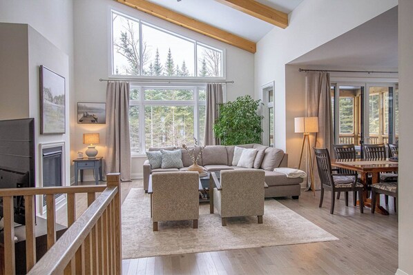 Flowing effortlessly from the living room, the well-equipped kitchen is a dream for culinary enthusiasts. Unlike many similar homes in the Northern Lights development, Evergreen Lodge stands out with its thoughtful touches—small appliances at your fingertips, a collection of cookbooks brimming with inspiration, and a layout designed for both function and warmth. Just off the kitchen, the three-season Muskoka Room provides a serene space to enjoy an evening meal, swap stories over appetizers, or simply listen to the rustling of the evergreens.