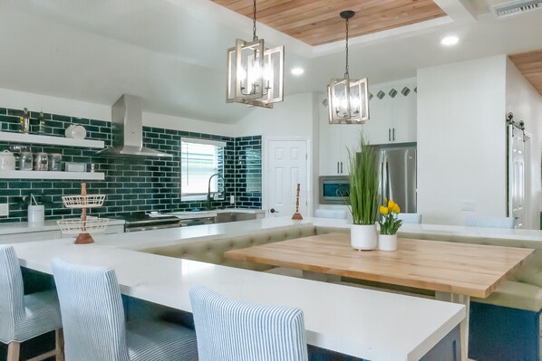 The kitchen is fully stocked and has ample seating for your group of 15. The living room is perfectly staged for night-time movies and relaxing after a long day on the lake. The outdoors is the focus of this home. Every area of this home has been completely renovated and staged for your group to spend a fun time on the lake. The home has plenty of kayaks, paddle boards, a canoe, and a pedal boat. There's no doubt that your time at this home will be filled with adventure and fun.