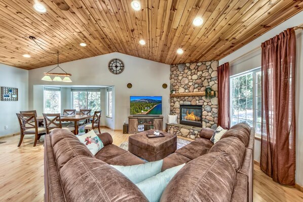 When the day is done, unwind in the primary suite’s jetted tub beneath the dual-sided gas fireplace. End your day curled up in the cozy king bed, watching a movie on the 50” TV or soaking up the peace and quiet of the Sierras as you doze off.