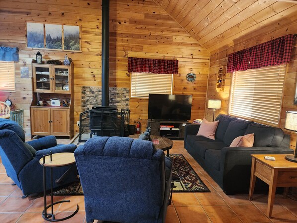 Inside, the cabin is adorned with beautiful tongue and groove throughout, creating a warm and inviting atmosphere. The main floor boasts two bedrooms with queen beds, along with a full bath. Upstairs, you'll find three additional single beds and a convenient half bath.
