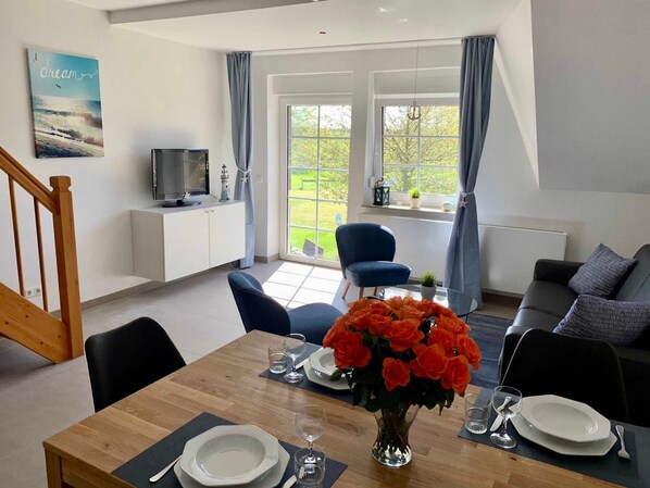 Die 3-Zimmer Maisonettewohnungen (70 m²) für Familien befinden sich im 1. OG und bieten einen wunderschönen Blick in die Natur. Die Maisonettewohnungen haben 2 Schlafzimmer mit Boxspringbetten, 2 Badezimmer, einen großen Wohnraum mit Couchgarnitur (Schlafsofa), eine integrierte Einbauküche mit Essbereich und einen Balkon. Die Küche ist in den großen Wohnraum integriert. Das Rauchen im Appartement ist nicht gestattet. Ausstattung: