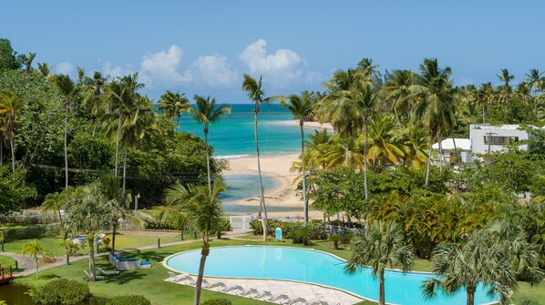 • Der Swimmingpool der Residenz befindet sich im Garten mit Blick auf den Strand von Las Ballenas.