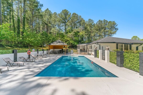This newly renovated house features a large outdoor space with a private, saltwater pool for extra fun summers. The home is nicely decorated and all newly renovated with spacious, modern kitchen and a completely open floorplan. Lots of parking on this private, acre parcel with covered parking! Perfect staycation getaway. Medical, insurance, & MTR welcome! Conveniently located 1.5 mi to Downtown L'ville with restaurants and entertainment & 3.5 mi from GA Gwinnett College and Northside Hospital!