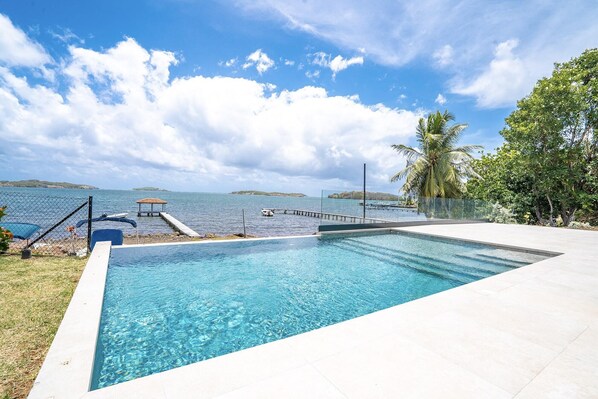 On the first floor is a large terrace that announces the theme of the stay: calm and convivial. There's a breathtaking view of the sea and an infinity pool to enjoy. The terrace includes a sitting area and a dining area with a large table.