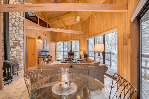 Upon entering this cabin you will notice the beams above you expanding from the center of the home lending to the octagon shape. You’ll then travel through the wooded hall and enter the great room and your eye will immediately be drawn to the impressive 2 story river rock chimney and will then be enticed to follow the angled walls all the way around the room. The living room feels expansive with the tall ceilings and open loft above and the pleasing furniture and wood-burning stove below.  Picture nestling into the cozy sofa next to a crackling fire and sipping your beverage of choice or stepping out onto the wrap-around deck to take in the bird’s eye view. Located on the main level you’ll find a queen size bedroom and full bathroom both displaying the fun shape of this home.  The compact kitchen is centrally located so you won’t miss a moment of excitement while creating some delicious treats to share with your group. Ascend the stairs to find a pleasant book nook just around the corner from the second full-size sofa bed situated below the skylights.