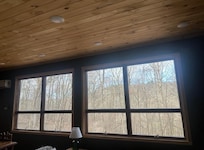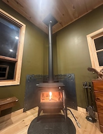 Inside, the cabin features a bright, open layout with expansive modern windows that bring the outdoors in. Natural wood ceilings, minimalist finishes, and a wood stove create a warm, inviting atmosphere. The space is thoughtfully equipped with a mini-split air conditioning system and in-wall heaters to ensure comfort in every season.