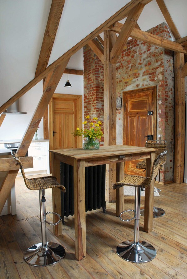 Auf 53m² haben Sie den Luxus einer komplett ausgestatteten Dachgeschosswohnung. Das Appartement ist vollklimatisiert und im Wohn/Schlafbereich nächtigen Sie in einem großzügigen Doppelbett. Entspannen Sie auf der Couch vorm HD-TV oder surfen Sie im Internet, welches drahtlos zur Verfügung steht. Das Bad, der Gründerzeit nachempfunden, besticht mit edler Keramik und Armaturen. Eine moderne Küche mit Geschirrspüler und hochwertigen Küchenutensilien macht das Kochen zum Vergnügen.