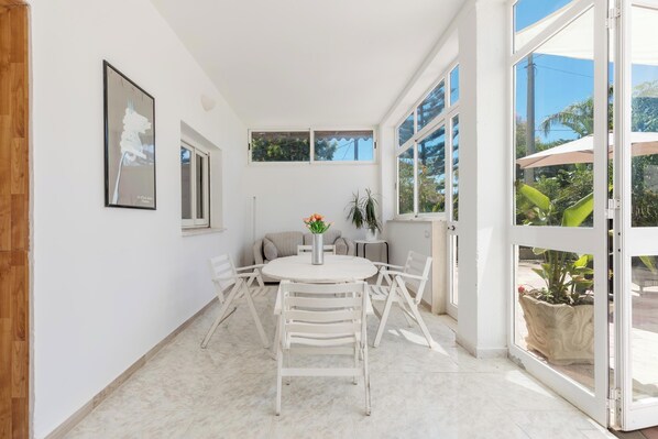 Large windows introduce the veranda, furnished for dining, dining and relaxing on the comfortable sofa.