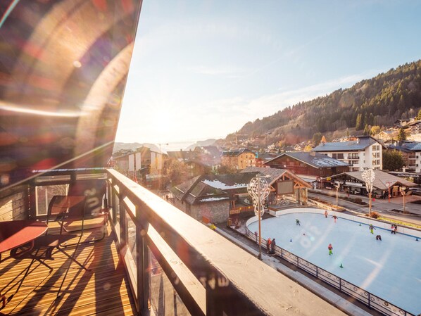 - Großes Wohnzimmer mit offener Küche und Zugang zu einem Balkon mit Blick auf das Dorf und die Hänge des Mont-Chéry