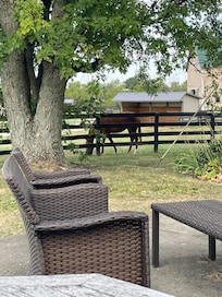 This place is out in the middle of horse country. The drive is absolutely beautiful. This house is in the middle of a horse farm. It is very peaceful. We only stayed one night but wish we could have stayed more. Waking up to the view of the hills in the background, the pasture, the pond and the horses. So relaxing. The house was spacious. Lots of room to relax. If you are a coffee drinker, you will want to bring your own coffee. There was a bit of decaf available, that was it. That would have been the only thing would have made the morning even better. The host was quick to respond to any questions we had. The manager there in the window kept a good eye on things ; Very friendly kitty.