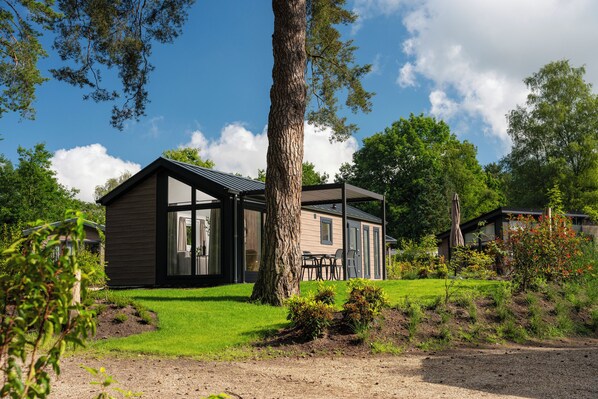Luxuriöse Cannenburch Deluxe mit Hot Tub. Genießen Sie einen Hot Tub, gemütlichen Außenbereich und voll ausgestattete Küche.
