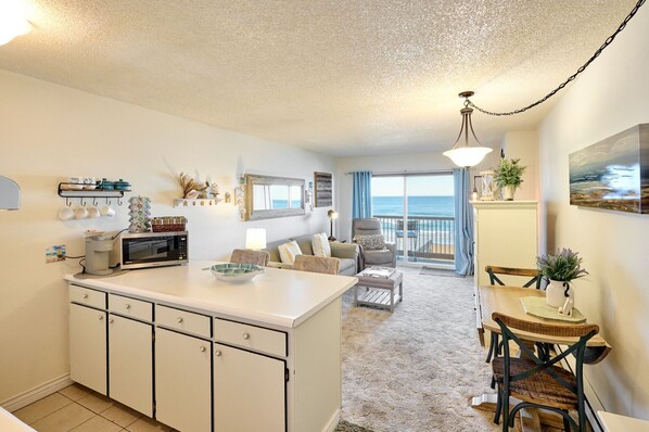 This charming condo is perfect for a relaxing coastal getaway. The spacious kitchen is fully equipped with everything you will need to cook up a delicious meal to enjoy with your family and friends. The whole condo is decorated to give you the best beachy vibes you could ask for! With two fireplaces, two TVs and a full bathroom, what could be better? This condo also has a queen bed with additional sleeping in the living area by way of a full-size sleeper sofa.