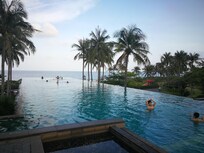 与同事好友在这里度过了二天,酒店的环境很好,最喜欢酒店绿化,满眼春意盎然,鸟语花香,海风吹过好舒服。每个别墅自成一体,独门小院,晚上每户都亮起灯笼,好有中国风;还有可以订餐在别墅内享用,与同事好友们玩得好开心;别墅走路不到2-3分钟就可以到海边,早上可以到海边看日出。我们在海边的无极泳池拍了很多在水中央的照片。另外早餐也不错,不足的是如果有麦片粥就更完美了,另外房间的灯光有点暗,稍亮一些会更好。有机会我们还会考虑再来。
