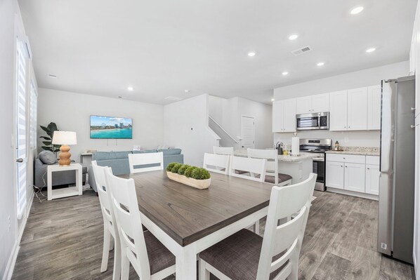 The spacious chef’s kitchen on the main level features an electric range and is fully equipped with all the essentials you need to create delicious meals. The dining table comfortably seats 6, and the breakfast bar offers additional seating with 2 chairs.