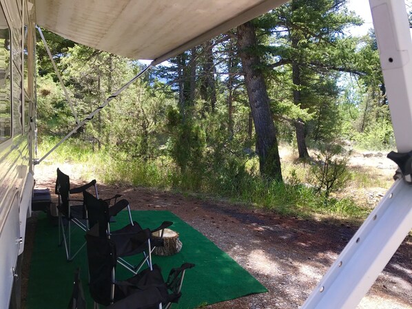 The Yellowstone River is 100 yds away from this 3 acre forested property. Host's cabin is located on property. There are seasonal rocky creeks (flows until about August-yet can come & go w/the weather), shade provided by tall pine trees. Jayco 25 ft. nice Travel Trailer w/AirCon/Heat. Kitchen; cookware, appliances, freezer/fridge, table/chairs dinette, storage spaces.Two accordion privacy doors, small closets to hang clothes, Bathroom; towels, hot Shower, small Bathtub, vanity sink and mirrors, Queen bed, small Full bed, Single Bunk bed, wide single sleeper Sofa. Smart TV. Campfire when local ordinance allows. Outdoor PicNic table & prep tablepropane BBQ, outdoor electric outlets, camp chairs, nearby: fine dining, live music, saloons, cafes, outdoor BBQ, bakeries, coffee, shopping, gyms, yoga, theaters, boats/inner tube/kayak rentals. Bozeman & 🏞 The Yellowstone National Park, whitewater or scenic Rafting are both 45 min. away. Yellowstone Hot Springs, Chico Hot Springs/Day Spa are 30 min. or less. 10 minutes away are Hiking & camping trailheads, Horseback-ride Outfitters. Walking distance: fishing access