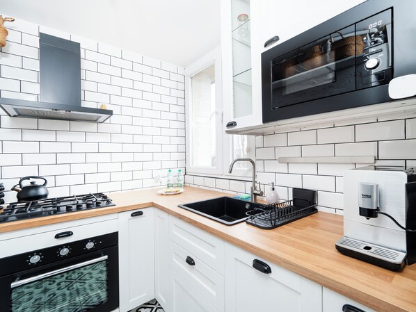 Dąbrowskiego Modern Apartment features a bright living room with a sofa bed, a kitchen, a bedroom with a comfortable double bed, a bathroom and a balcony — a perfect spot for morning coffee or a relaxing evening outdoors. The apartment is equipped with Wi-Fi, cable TV, a fridge with freezer, gas stove, dishwasher, oven, microwave, kettle, capsule coffee machine, washing machine, as well as an iron, hairdryer and vacuum cleaner. Air conditioning is also available, providing extra comfort, especially on warmer days. Guests can use the parking area, though space cannot be guaranteed.