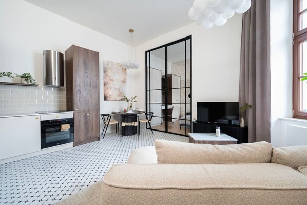 This stylish 42m² apartment on the 3rd floor is designed for up to 4 guests, offering a comfortable and convenient stay in the heart of the city. It features two rooms with a queen bed and a sofa bed, a dedicated working desk, and a fully equipped kitchen and bathroom. Enjoy a beautiful city view, fast Wi-Fi, and a Smart TV for your entertainment. The location is ideal, just 550 meters from Piotrkowska Street, 800 meters from Łódzka Mall, and 1.2 km from the nearest train station, with tram and bus stations nearby for easy transport. A complimentary set of toiletries, towels, coffee, and tea is provided to enhance your stay. Self check-in and check-out ensure flexibility, and we issue VAT invoices upon request. Feel free to contact us for more details or to book your stay!