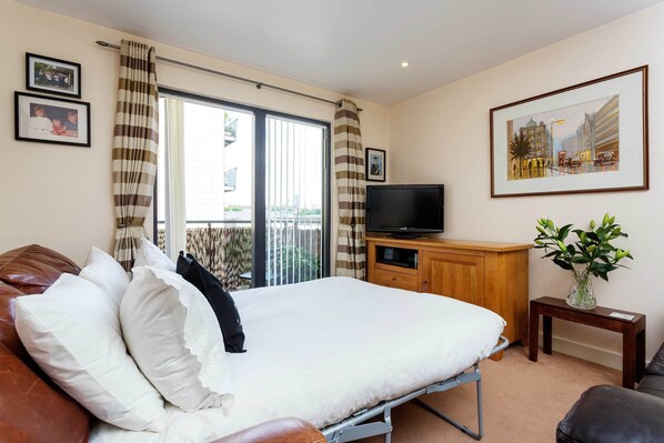 Das Schlafzimmer verfügt über ein bequemes Kingsize-Bett, einen Kleiderschrank gegenüber und einen Fernseher für Unterhaltung. Vom Fenster aus haben Sie einen schönen Blick auf die Stadt.