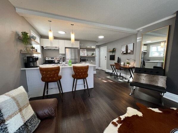 The fully stocked kitchen has everything you need to prepare meals during your stay, from the full-size fridge and stove to the Keurig coffee maker that’ll keep you energized throughout the day.