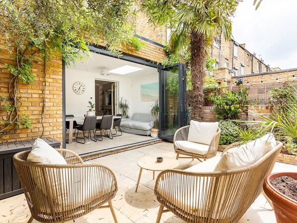 The bi-fold doors reveal a delightful terraced garden complete with cosy seating and a state-of-the-art BBQ, providing a serene outdoor space to unwind. The festoon garden lighting creates a warm and inviting atmosphere, making it ideal for outdoor gatherings.