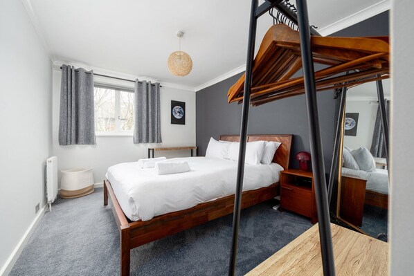 The bedroom contains a comfortable king-size bed with complimentary hotel-quality linens to ensure a good night's sleep and multiple storage spaces.