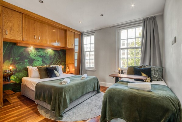 Step into a lush Urban Jungle retreat on Edgware Road, where high-end luxury meets nature-inspired design. Perfect for families, friends, or colleagues, this stylish 3-bath apartment features a spacious 30m² lounge, plush green velvet seating, and full AC. Just steps from Oxford St, Hyde Park & Mayfair, it’s ideal for shopping, dining & exploring. Unwind, socialize, and make memories in this unique London stay.