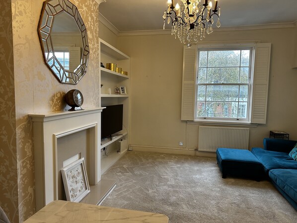 Living Room: Luxury velvet 3 seat sofa with foot stool ; 4 seater dining table; luxurious cream soft and thick carpets; shuttered windows; triple glazed windows; LCD TV; high speed broadband wifi; high ceilings with beautiful chandelier.